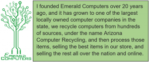 After graduating from NAU I started consulting with small businesses helping them be better, and soon discovered that I could do this even better by helping them catch up with IT standards. Soon I was helping businesses deploy technology full time, and soon after that I founded Emerald Computers out of my house in Phoenix. It grew larger and soon I had a retail store on Peoria and 44th Ave, and then in 2004 I moved to Peoria, and the same year I opened a second store in Phoenix. I was also highly interested in Politics and Real Estate. In 2006 I was introduced to my wife Gem and soon after we got married. I sold my computer business and moved to the Philippines. I lived there for about 18 months, and rented out rooms in my Peoria home. During this time I opened a tile export business from the Philippines and sold the tile in the US. Eventually the people who bought my two computer stores let them fail and once my wife legally could come to the US I returned to Peoria with her, and started my computer business over again, this time in Peoria. In the last few years the business has grown to be one of the largest computer stores in the state. You can visit it any day but sunday, it is located right here in the Acacia district at 7642 W Vogel. We are a Green computer company, and mostly sell recycled computers, helping the environment and helping people get great deals.